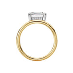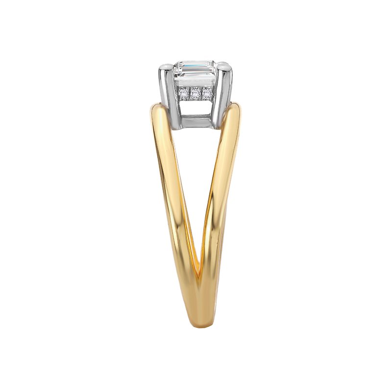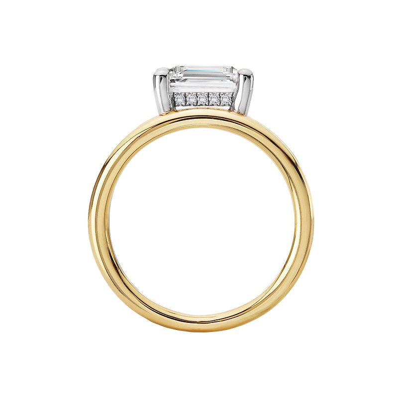 This elegant 14K yellow gold semi-mount engagement ring features a split shank design and a hidden halo of diamonds beneath the center setting, adding subtle sparkle and dimension. Designed to accommodate a 7.5 x 5.5mm emerald-cut stone, this ring combines modern sophistication with timeless elegance.