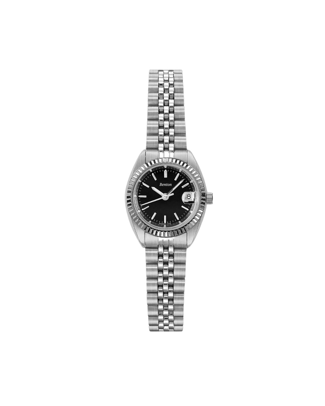 The Benton 24 mm Classic combines sleek design with dependable performance. Featuring a stainless-steel case and bracelet with a fluted bezel, this watch pairs a black dial with index markers and luminous hands for effortless readability. Built for durability, it includes a diver security lock buckle, sapphire crystal with magnifying lens, and is rated 10 ATM water resistant, making it ideal for everyday wear.