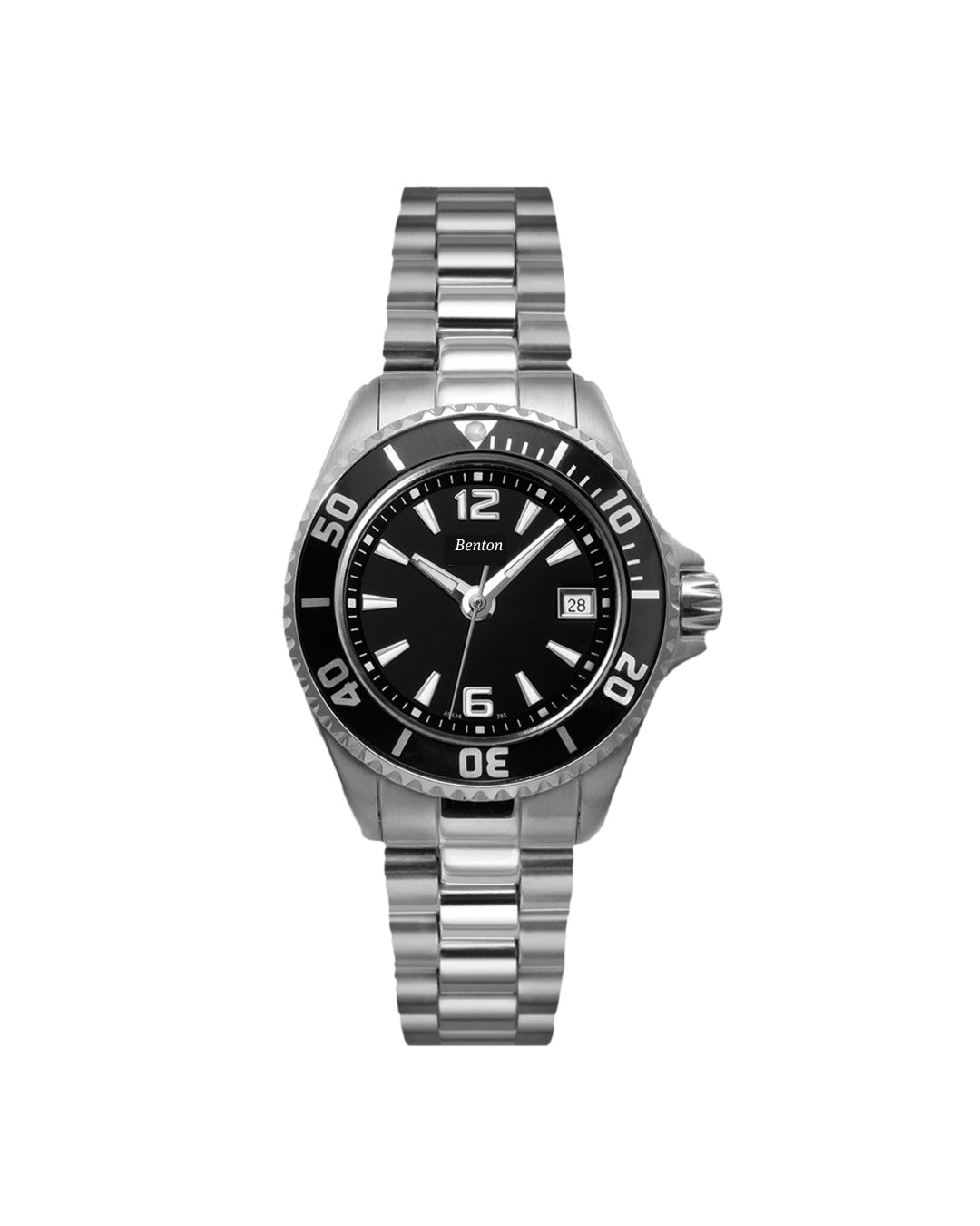 Bold, functional, and stylish, the Benton 30 mm Diver Watch combines professional diver features with everyday wearability. Crafted with a stainless-steel case and bracelet, it features a luminous dial and hands for easy readability and a one-directional rotating diver bezel for precise timing. Designed for durability, this timepiece includes a diver security lock buckle, screw-down crown, and sapphire crystal with magnifying lens, while offering 10 ATM water resistance for confident wear in aquatic environments.
