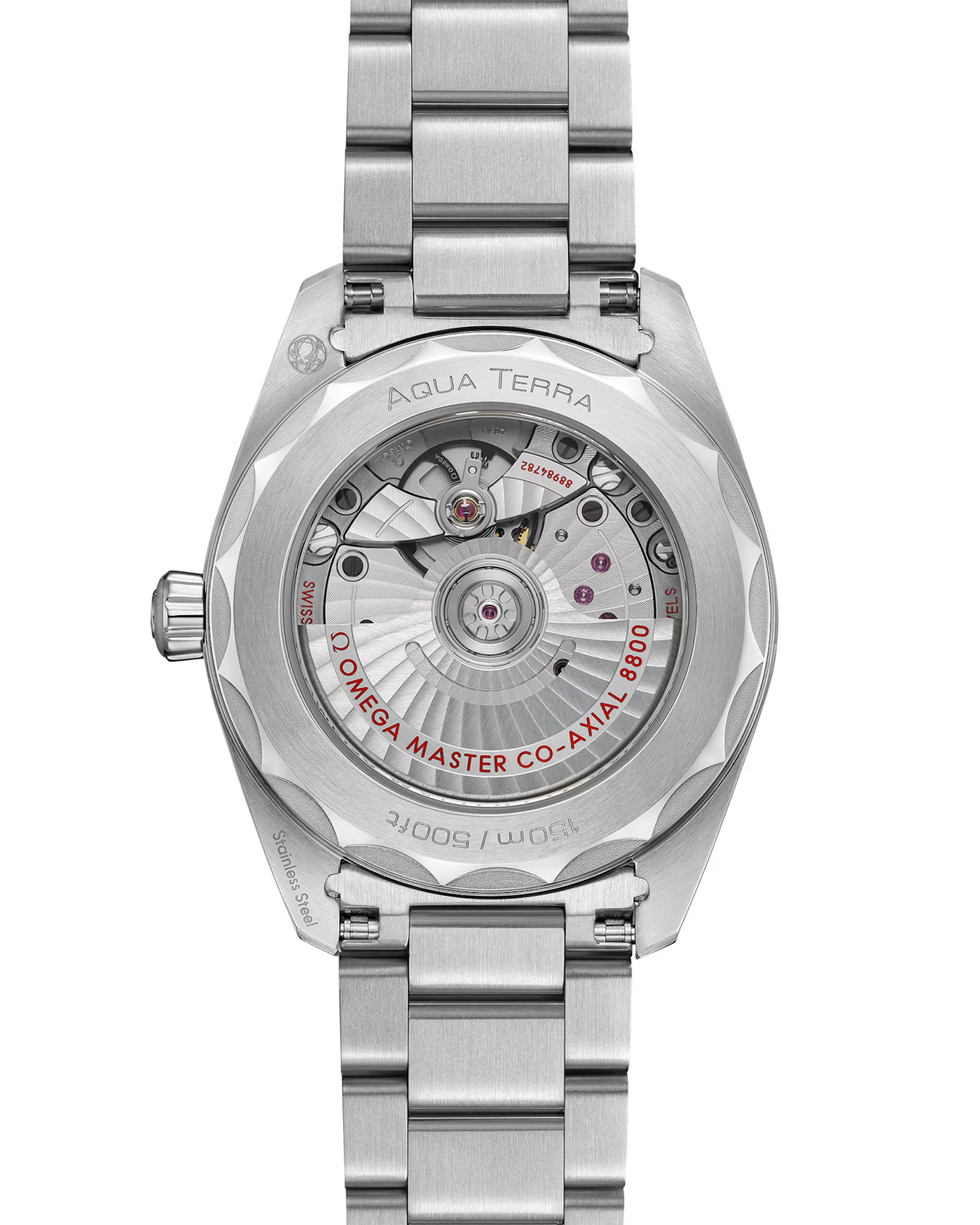 The Seamaster Aqua Terra is a superb tribute to OMEGA’s rich maritime heritage. In this 38mm model, the symmetrical case has been crafted from stainless steel, with a wave-edged design featured on the back. The blue dial is sun-brushed and is distinguished by a horizontal “teak” pattern which is inspired by the wooden decks of luxury sailboats. There is also a date window at 6 o'clock and rhodium-plated hands and indexes filled with white Super-LumiNova. Presented on a polished and brushed bracelet, this certified chronometer is powered by the OMEGA Master Chronometer calibre 8800, certified at the industry’s highest standard by the Swiss Federal Institute of Metrology (METAS).