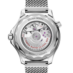 Since 1993, the Seamaster Diver 300M has enjoyed a legendary following. Today’s modern collection has embraced that famous ocean heritage and updated it with OMEGA’s most advanced innovation and design. This 42 mm model is crafted in stainless steel and includes a black oxalic anodized aluminium bezel ring with a diving scale in white Super-LumiNova. Black aluminium is also used to create the dial, which is laser-engraved with the Diver’s iconic wave pattern. The skeletonized hands and indexes are rhodium plated and filled with white Super-LumiNova, while the other markings, including the OMEGA logo, are transferred in white. The watch is presented on a brushed mesh bracelet with clasp, and is driven by the OMEGA Co-Axial Master Chronometer Calibre 8806, which can be seen through the sapphire-crystal caseback.