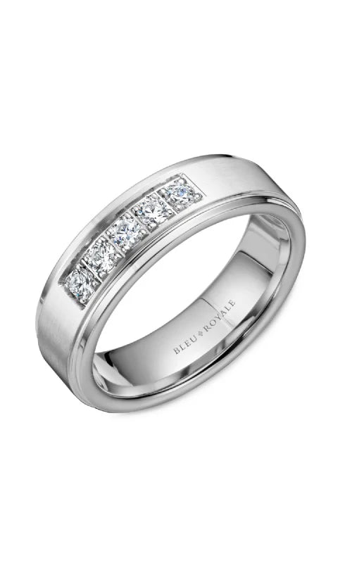 This bold 7.5mm men’s wedding band from Bleu Royale is crafted in rich 14K yellow gold and set with six princess-cut black diamonds totaling .60 carats. The rounded profile adds comfort, while the striking contrast of gold and black diamonds creates a powerful, modern design. A distinctive choice for the groom who wants a ring as unique as his style.