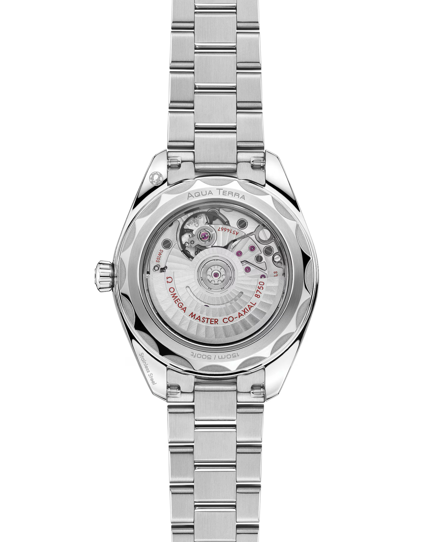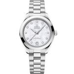 The Seamaster Aqua Terra is a superb tribute to OMEGA’s rich maritime heritage. This slim 30 mm model achieves its refined proportions through OMEGA's innovative Co-Axial Master Chronometer calibre 8750, certified at the industry's highest standard by the Swiss Federal Institute of Metrology (METAS). This stainless steel model has a symmetrical polished case and features a screw-in caseback with wave-edged design. The white mother-of-pearl dial is in full glossy finish, with a circular date window at 6 o’clock. It is highlighted by 11 diamond hour markers and redesigned faceted hands, with the minute hand tapering to a delicate point. All the applied elements and hands are in 18K white gold, while the hands are also filled with white Super-LumiNova which emits a blue glow. The watch is presented on an integrated stainless-steel bracelet with beautifully rounded polished-brushed links, a foldover butterfly clasp, and OMEGA’s easy comfort-adjustment system.