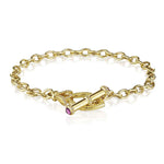 The Verragio 18K Yellow Gold Beaded Rhodolite and Diamond Toggle Bracelet is an exquisite piece featuring vibrant rhodolite gemstones and 0.20 carats total weight of diamonds, graded GH color and SI1-SI2 clarity. The bracelet is crafted in luxurious 18K yellow gold with intricate beaded detailing, adding texture and sophistication. The toggle clasp not only ensures a secure fit but also adds a stylish touch. Measuring 7" in length, this bracelet combines the rich hue of rhodolite with the brilliance of diamonds, making it a striking and elegant accessory.