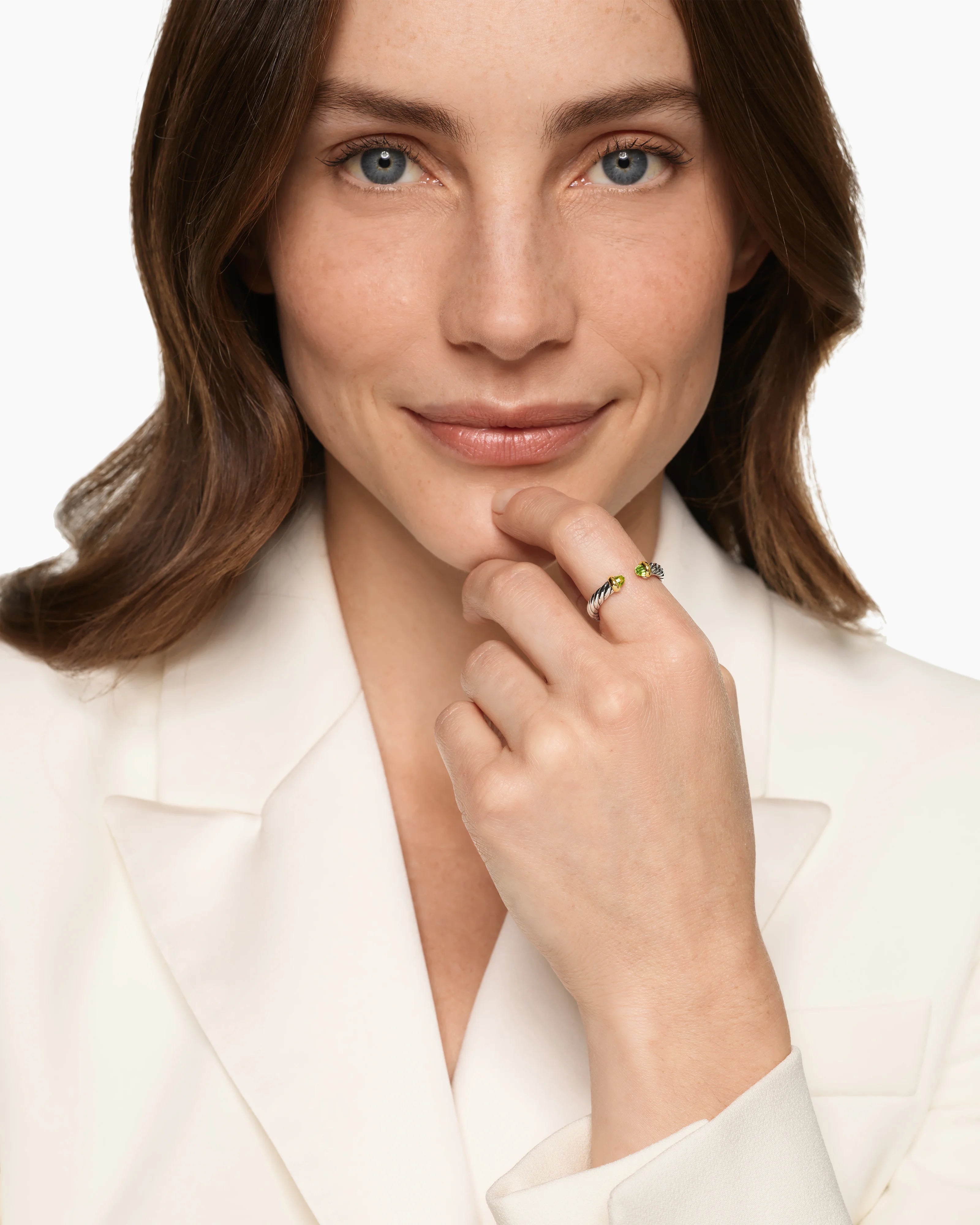 David Yurman’s iconic Cable motif subtly adorns a universal symbol or shape, creating a modern talisman meant to be collected, combined and treasured. Sterling silver with 14-karat yellow gold Peridot Ring, 3.4mm Style #R18268 S4APR UPC 192740524240